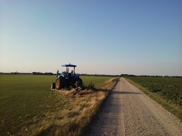 Ein Traktor quasi als Pumpenantrieb am Brunnen vor einem Feld wo Rollrasen angepflanzt ist. Zwischen Parbasdorf und Raasdorf im Marchfeld.